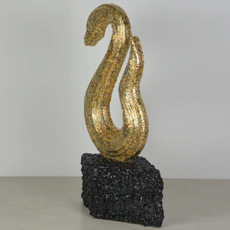 Diese goldene Schlangenfigur ist eine beeindruckende Bereicherung für jede Einrichtung. Sie ist kunstvoll aus robustem Polyurethan gefertigt und mit einer strukturierten, geprägten Oberfläche versehen. Die oxidierte Blattgoldauflage verleiht ihr einen Hauch von Eleganz. Die Figur steht auf einem stabilen Marmorsockel und ist mit schwarzer Emaille verziert, wodurch ein markanter visueller Kontrast entsteht.