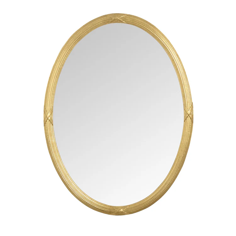Elegante Rippen, verziert mit X-förmigen Details, prägen das feine, handgeschnitzte Muster des Holzrahmens dieses ovalen Wandspiegels – ein exquisites Design im klassischen englischen Stil. Der edle ovale Rahmen, der mit schimmerndem Blattgold für einen Hauch eleganter Opulenz überzogen ist, umschließt einen hochwertigen italienischen Kristallspiegel (4 mm dick) mit den Maßen 50 x 70 cm.